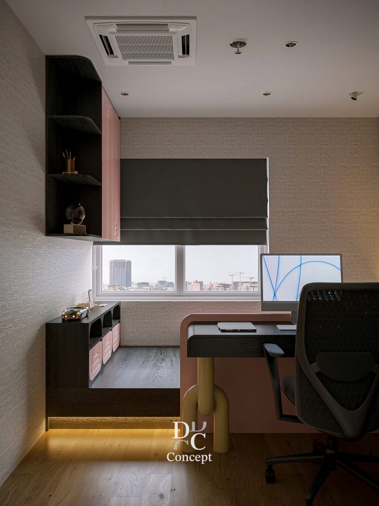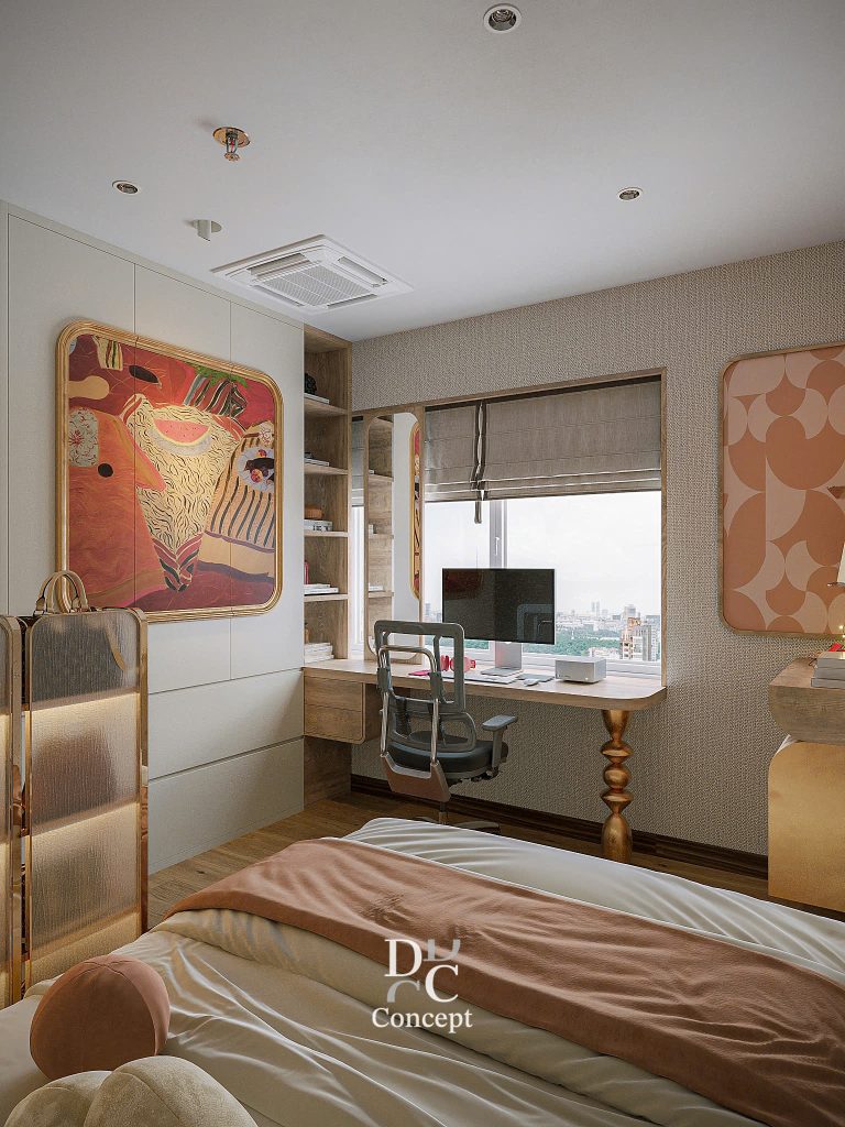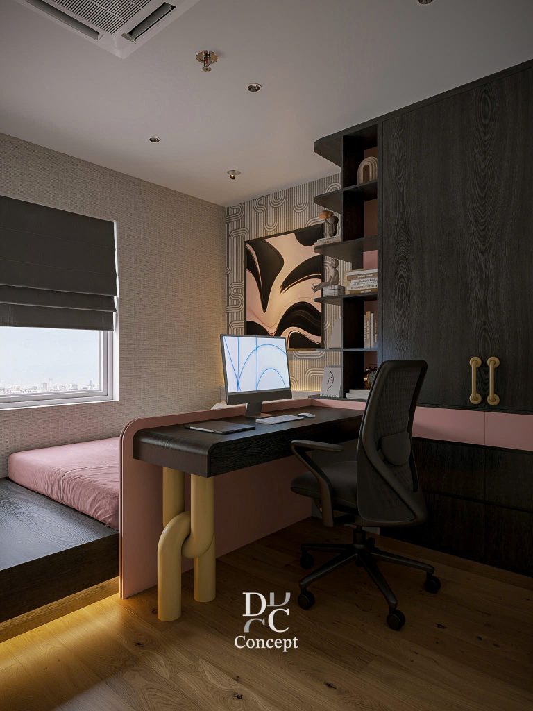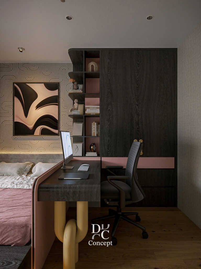 Không gian phòng ngủ được thiết kế như một “tổ kén” riêng tư, nơi mỗi chi tiết đều hướng đến sự cân bằng giữa nghỉ ngơi và hiệu suất làm việc. DC CONCEPT tạo nên một tổng thể vừa ấm áp, vừa thời thượng với gam màu trầm chủ đạo, kết hợp sắc hồng dusty pink điểm xuyết đầy tinh tế – đủ mềm mại nhưng không mất đi nét hiện đại.Góc làm việc được bố trí thông minh liền kề cửa sổ, tận dụng tối đa ánh sáng tự nhiên, giúp gia chủ luôn giữ được sự tỉnh táo, tập trung và tràn đầy năng lượng sáng tạo. Thiết kế bàn bo cong mềm mại kết hợp chân trụ ánh kim mang đến dấu ấn thẩm mỹ đặc trưng, cân bằng giữa “công năng – nghệ thuật – cảm xúc”.