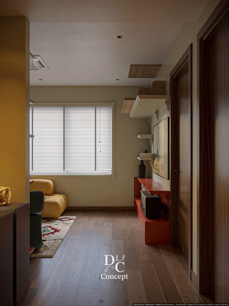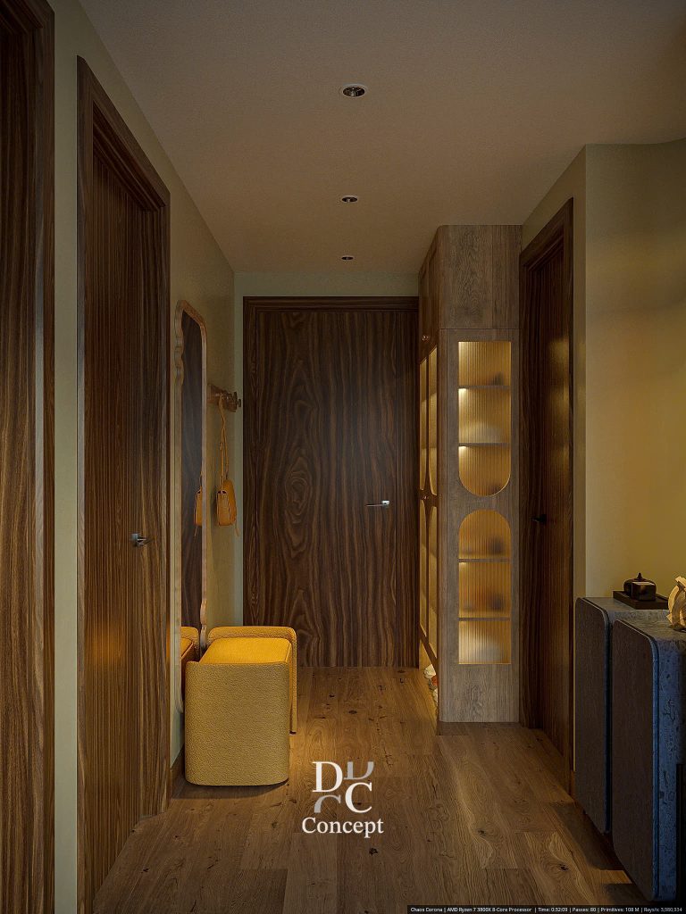 Không gian sảnh và hành lang được DC CONCEPT xử lý như một “khoảnh khắc chạm cảm giác” – nơi nhịp sống bên ngoài được tách nhẹ trước khi bước vào sự bình yên của tổ ấm. Hệ màu gỗ ấm kết hợp ánh sáng vàng dịu tạo cảm giác thư thái, chào đón gia chủ ngay từ giây phút mở cửa.