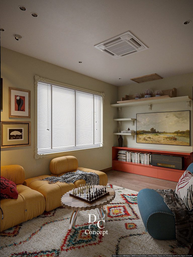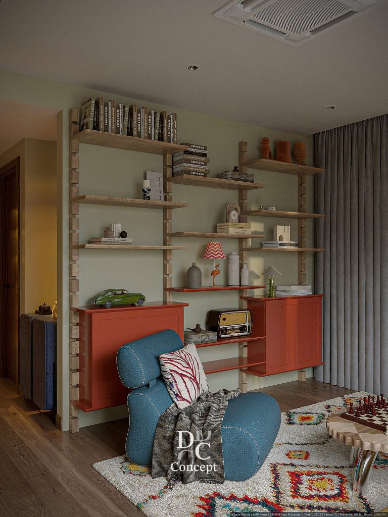 Một góc thư giãn được thiết kế đầy cảm hứng – nơi sự sáng tạo và cảm xúc được khơi mở một cách tự nhiên. Không gian nổi bật với hệ kệ trang trí tối giản theo phong cách hiện đại, sử dụng chất liệu gỗ mộc mạc kết hợp bố cục mở, giúp tối ưu lưu trữ mà vẫn giữ được sự thoáng đãng và thẩm mỹ.Chiếc ghế lounge xanh teal với đường may nổi thủ công trở thành điểm nhấn đầy cá tính, mang lại cảm giác êm ái và gần gũi, lý tưởng cho việc đọc sách, thư giãn hay tận hưởng những phút giây riêng tư. Sắc cam đất của hệ tủ và phụ kiện décor tạo điểm cân bằng thị giác, mang đến năng lượng ấm áp và đầy nghệ thuật cho căn phòng.