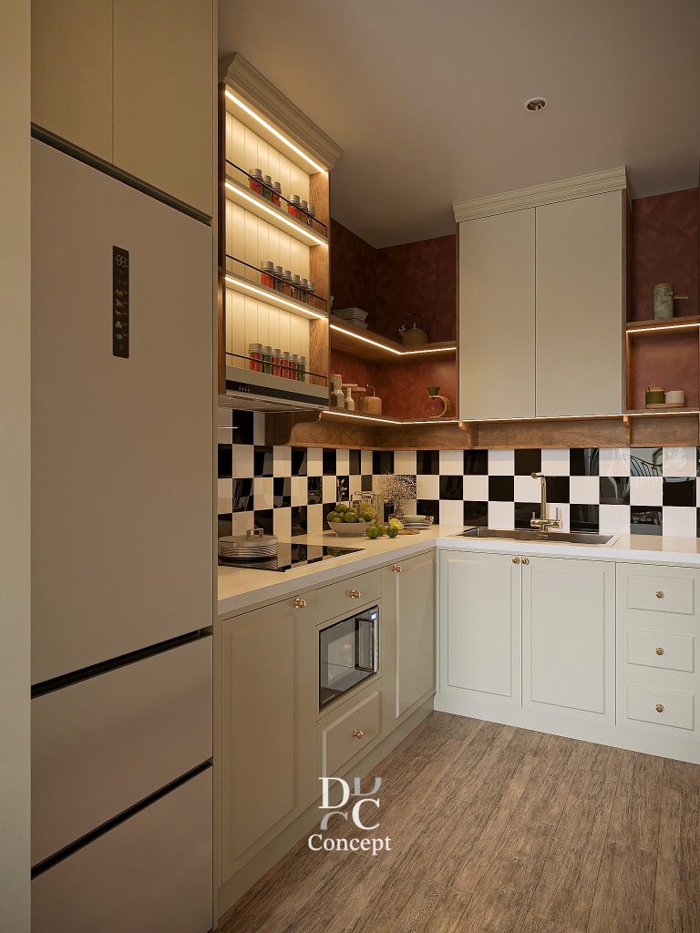 Điểm nhấn nằm ở mảng gạch ốp đen – trắng checkerboard đầy cá tính, gợi chất retro hiện đại, vừa giúp không gian sinh động hơn vừa tạo cảm giác sạch sẽ và thẩm mỹ. Hệ đèn hắt được bố trí tinh tế trong từng khoang tủ, chiếu sáng vừa đủ, tạo chiều sâu và tôn lên vẻ đẹp của chất liệu.