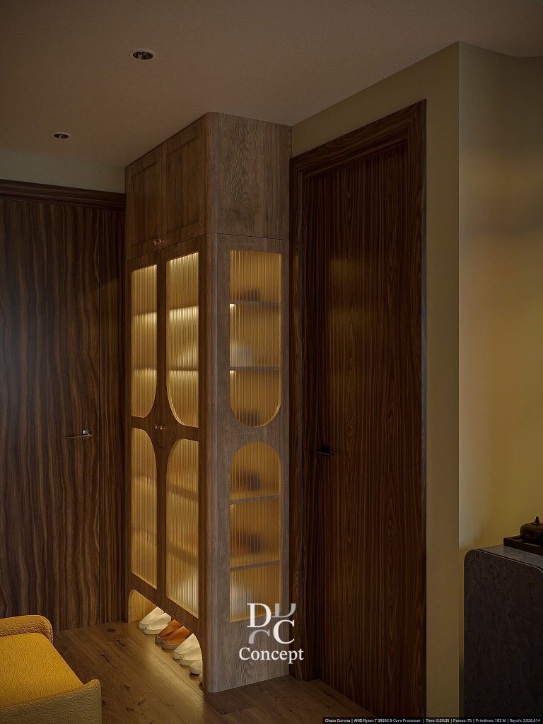 Chiếc ghế ottoman nhỏ gọn kết hợp gương treo tường với chi tiết bo tròn mang nét mềm mại, giúp việc thay giày – cất áo khoác trở thành một trải nghiệm tiện nghi và tinh tế. Hệ tủ trang trí với cánh kính mờ uốn cong, ánh sáng hắt nhẹ từ bên trong gợi cảm giác sang trọng và có chiều sâu – một dấu ấn tạo nên DNA thẩm mỹ riêng của DC CONCEPT.